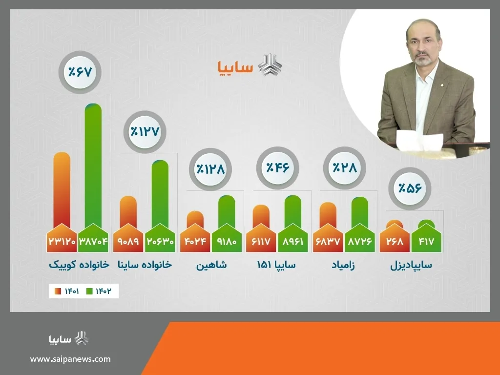 مدیرعامل گروه خودروسازی سایپا تاكید كرد: از ابتدای سال جاری تا 7 خردادماه، 38 هزار و 704 دستگاه خودرو در خانواده كوییك تولید شده است. این عدد تا 7 خردادماه سال 1401، حدود 23 هزار و 120 دستگاه بوده، بدین جهت در این بخش رشد 67 درصدی حاصل شده است.همچنین در مدت عنوان شده، در تولید خانواده ساینا رشد 127 درصدی ثبت شده است. سال گذشته و در زمان مشابه 9 هزار و 89 دستگاه خودرو از خانواده ساینا تولید شده بود و اكنون این عدد به 20 هزار و 630 دستگاه رسیده است.