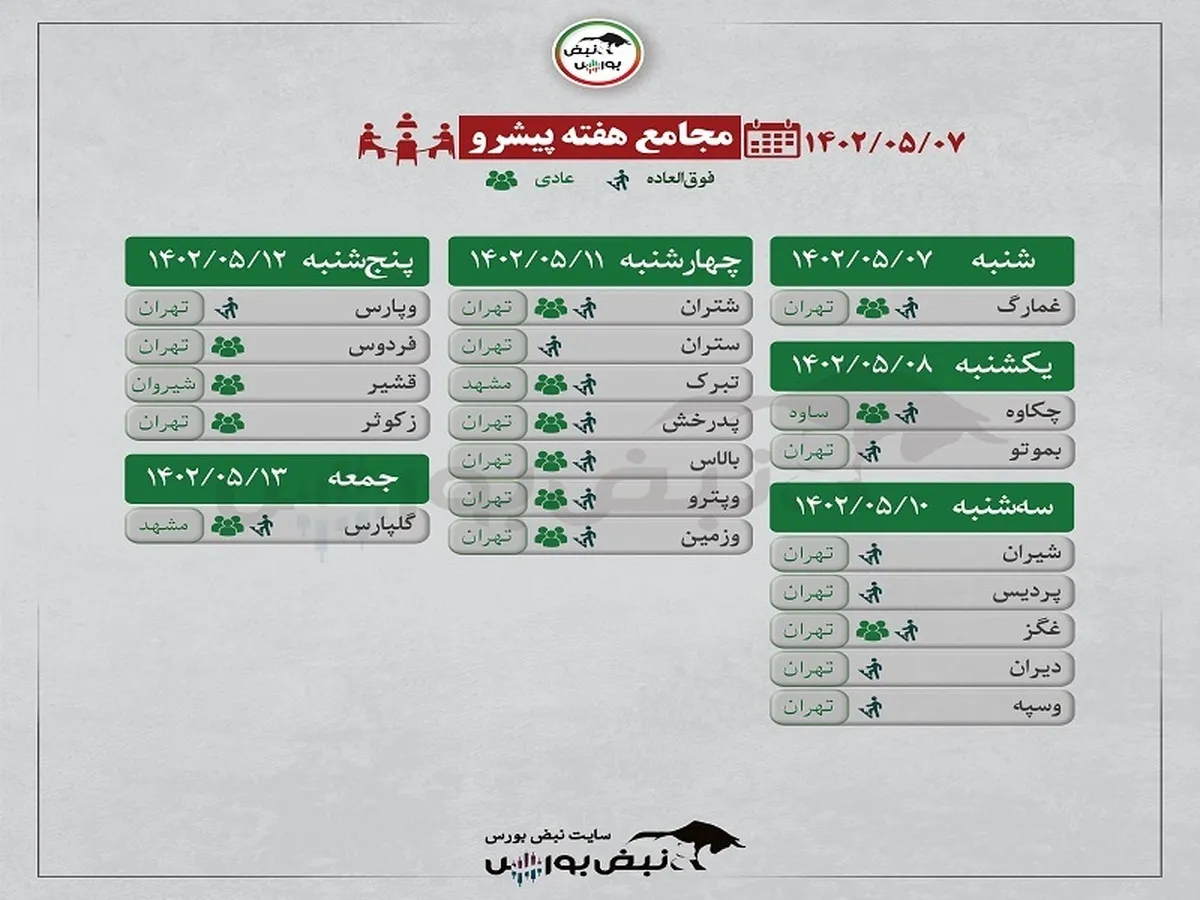 پروانه محمدی کیا| به گزارش نبض بورس، شرکتهایی که در جدول زیر آمده است در هفته جاری (۷ مردادماه تا ۱۲ مردادماه) مجمع عمومی عادی سالیانه و مجمع عمومی فوقالعاده خود را برگزار خواهند کرد و در خصوص (تطابق اساسنامه شرکت با نمونه اساسنامه سازمان بورس، انتخاب اعضای هیئتمدیره، افزایش سرمایه) تصمیمگیری میکنند.