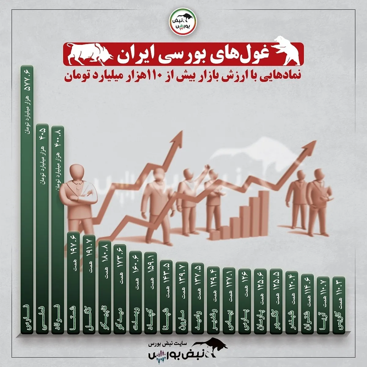 به گزارش نبض بورس، برخی از سهام به دلیل اندازه بازار آن‌ها همواره مورد استقبال سهامداران قرار می‌گیرند و اصطلاحا از آن‌ها به عنوان سهام شاخص ساز یاد می‌شود. در این مطلب قصد داریم شما را با غول‌های بورسی ایران آشنا کنیم. غول‌هایی که ارزش بازار آن‌ها بیش از ۱۱۰ هزار میلیارد تومان می‌باشد.