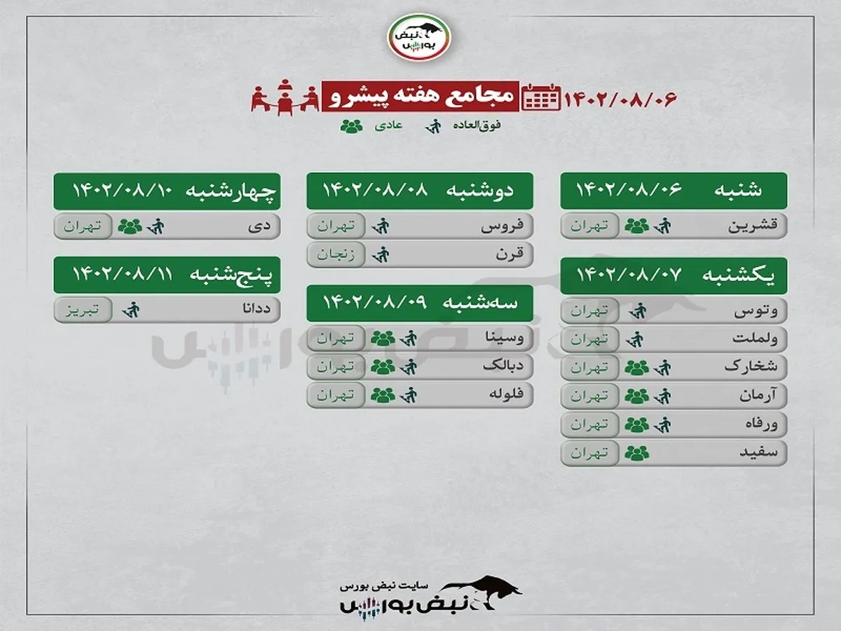 به گزارش نبض بورس، شرکتهایی که در جدول زیر آمده است درتاریخ ۶ آبان ماه تا ۱۱ آبان ماه مجمع عمومی عادی سالیانه و مجمع عمومی فوقالعاده خود را برگزار خواهند کرد و در خصوص (تطابق اساسنامه شرکت با نمونه اساسنامه سازمان بورس، انتخاب اعضای هیئتمدیره، افزایش سرمایه) تصمیمگیری میکنند
