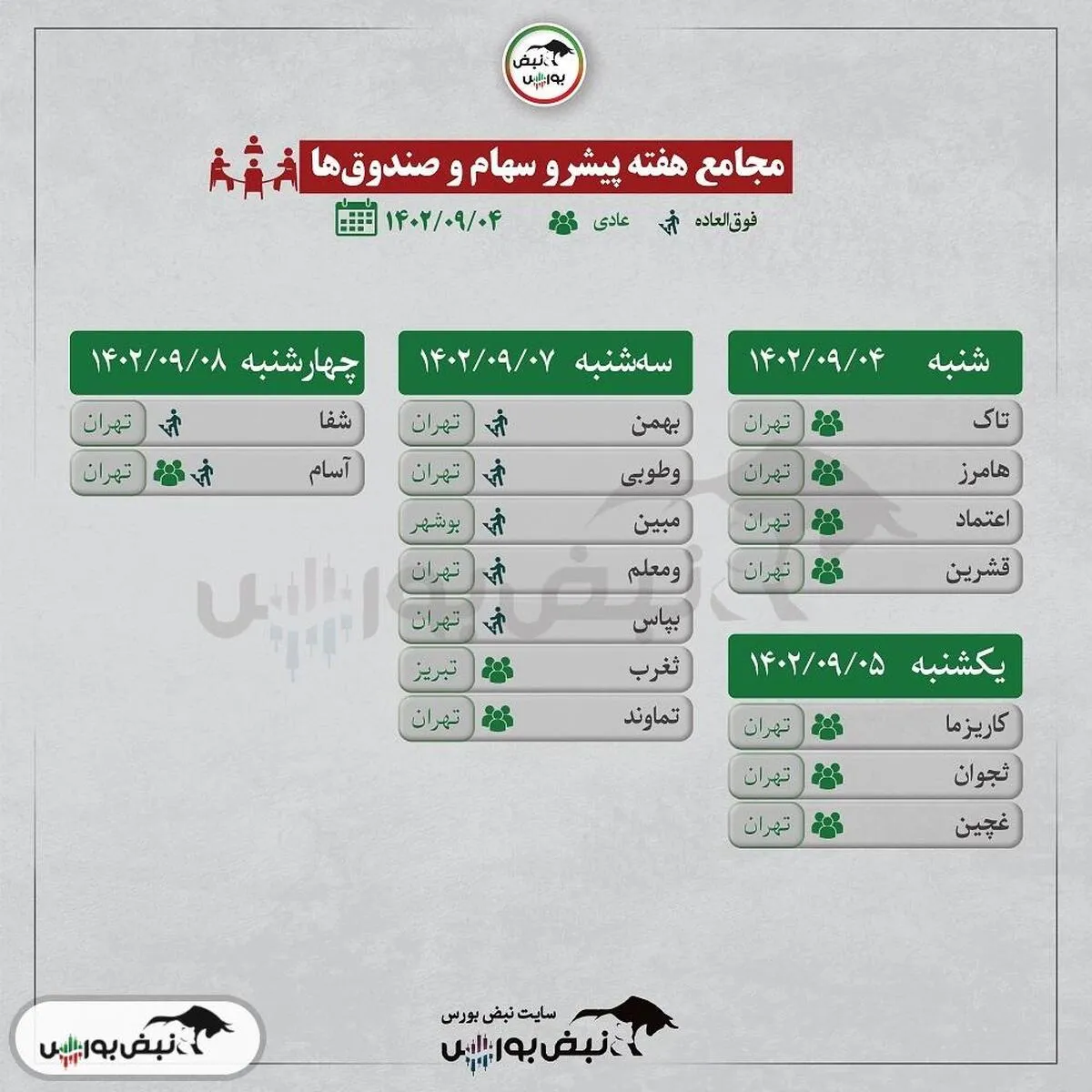 به گزارش نبض بورس،  شرکت‌هایی که در جدول زیر آمده است درتاریخ ۴ آذرماه تا ۹ آذرماه مجمع عمومی عادی سالیانه و مجمع عمومی فوق‌العاده‌‎ خود را برگزار خواهند کرد و در خصوص (تطابق اساسنامه شرکت با نمونه اساسنامه سازمان بورس، انتخاب اعضای هیئت‌مدیره، افزایش سرمایه) تصمیم‌گیری می‌کنند