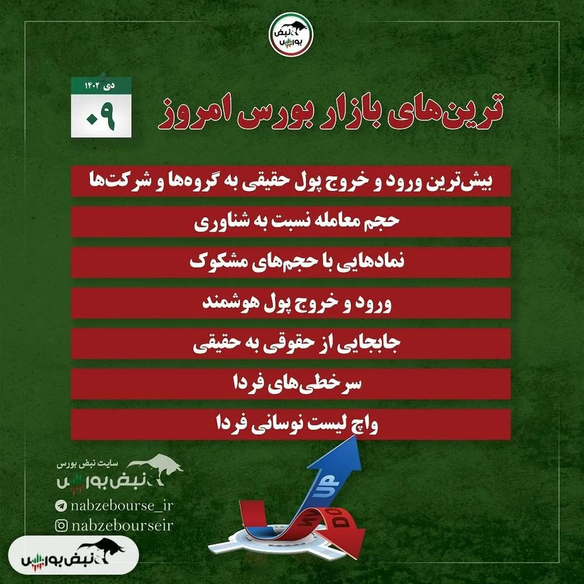 در این مطلب قصد داریم تا به بررسی ترین‌های بورس امروز شنبه ۹ دی ۱۴۰۲ بپردازیم. کدام نماد‌ها ورود پول حقیقی داشتند؟