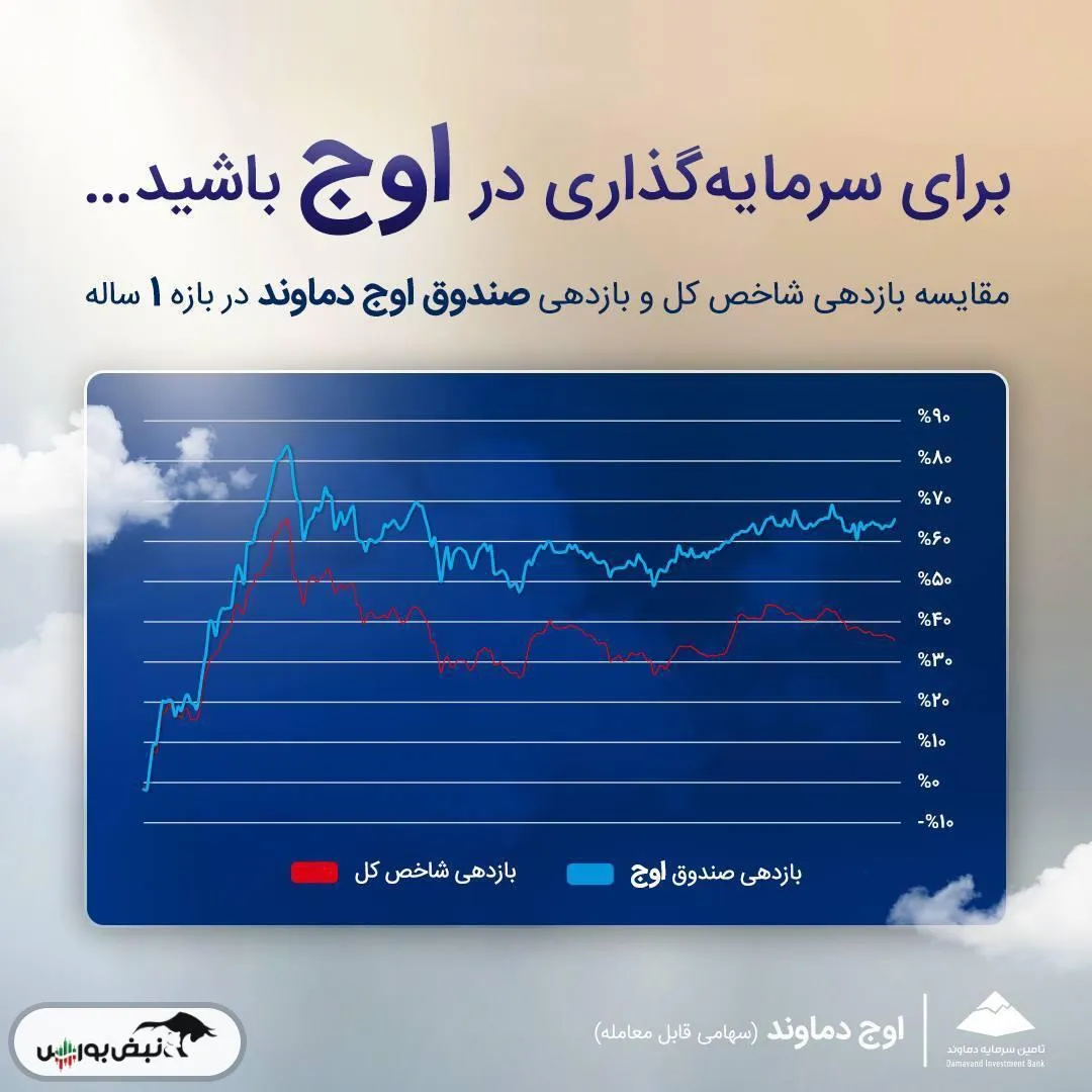 مقایسه بازدهی شاخص کل و بازدهی صندوق اوج دماوند در بازه ۱ ساله