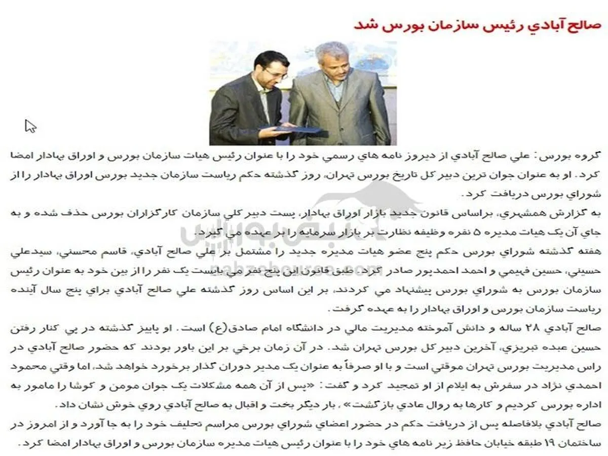 ۷ خرداد ۱۳۸۵، صالح آبادی رئیس سازمان بورس شد. علي صالح آبادي نامه هاي رسمي خود را با عنوان رئيس هيات سازمان بورس و اوراق بهادار امضا كرد. او به عنوان جوان ترين دبيركل تاريخ بورس تهران، حكم رياست سازمان جديد بورس اوراق بهادار را از شوراي بورس دريافت كرد.