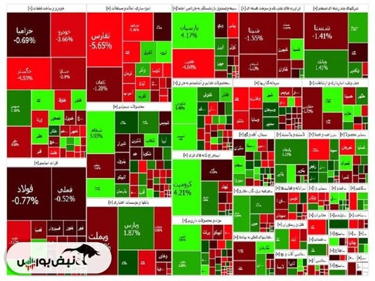 نقشه بازار بورس ـ سهشنبه ۱۹ تیر ۱۴۰۳فارس بیشترین تاثیر مثبت را بر شاخص کل داشت اما شپنا و وبملت تاثیر منفی ایجاد کردند. ذوب، شستا و خزامیا نیز از نمادهای پرتراکنش بودند که هر سه نماد قرمز شدند.