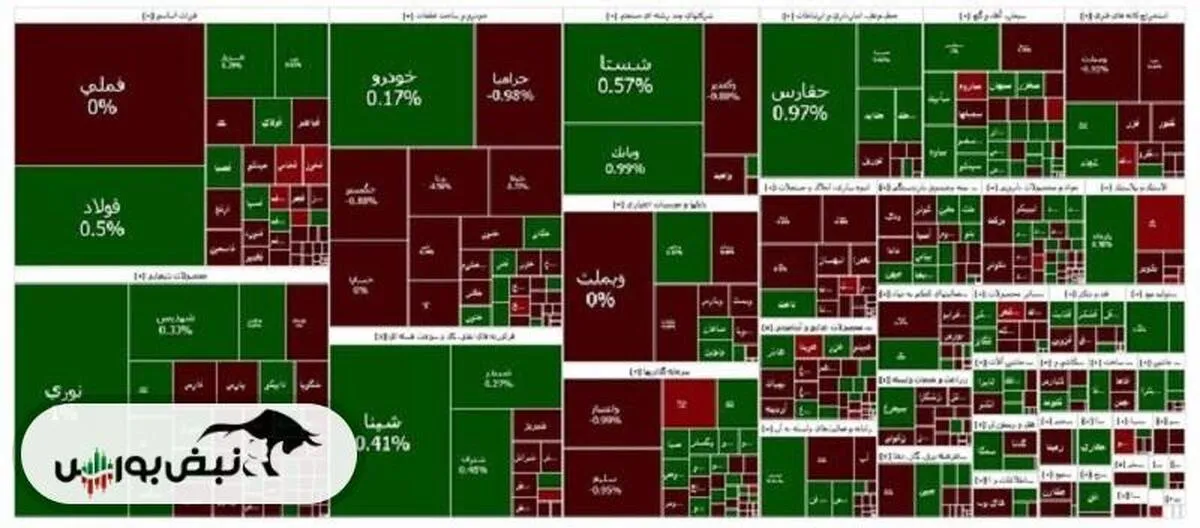 نقشه بازار بورس یکشنبه ۲۱ مرداد ۱۴۰۳نوری بیشترین تاثیر مثبت را بر شاخص بورس داشت اما شپنا و وبملت اثر منفی ایجاد کردند.