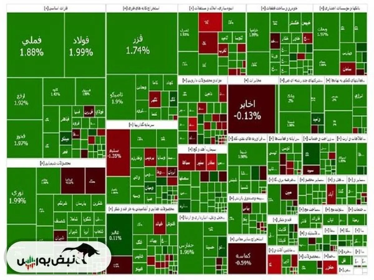 نقشه بازار بورس ـ یکشنبه ۲۸ مرداد ۱۴۰۳فملی، فولاد و فارس بیشترین اثر مثبت را بر شاخص بورس داشتند. هم چنین فملی، اخابر و فولاد از نمادهای پرتراکنش بودند.