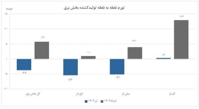 براساس این گزارش، در تیر ماه سال جاری، درصد تغییرات شاخص قیمت تولیدکننده کل بخش برق نسبت به ماه قبل (تورم ماهانه) منفی ۰.۱ درصد محاسبه شده که در مقایسه با همین اطلاع در ماه قبل (۰.۶- درصد)، ۰.۵ واحد درصد افزایش داشته است؛ به عبارتی، میانگین قیمت دریافتی توسط نیروگاههای برق به ازای فروش محصول خود به شرکتهای توزیع برق، در تیر ماه ۱۴۰۳ نسبت به ماه قبل، ۰.۱ درصد کاهش دارد. در ماه مورد بررسی، تغییرات شاخص قیمت تولیدکننده بخش برق نسبت به ماه قبل، برای ساعات مختلف اوجبار، میانبار و کمبار، به ترتیب ۰.۲، ۰.۲- و صفر درصد بوده است.