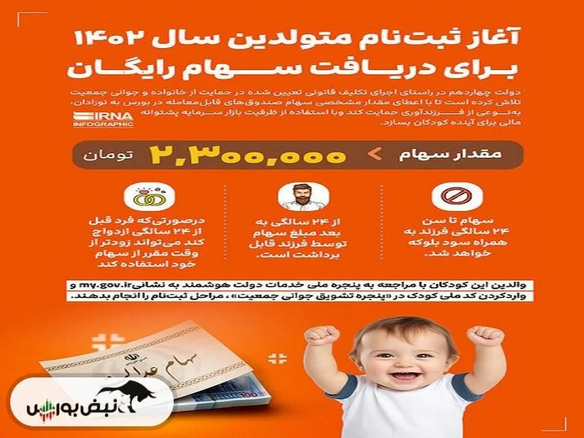 دولت به هر کودکی که در سال ۱۴۰۲ متولد شده است، معادل بیست و سه میلیون ریال سهام صندوقهای سرمایهگذاری قابلمعامله در بورس اعطا میکند.