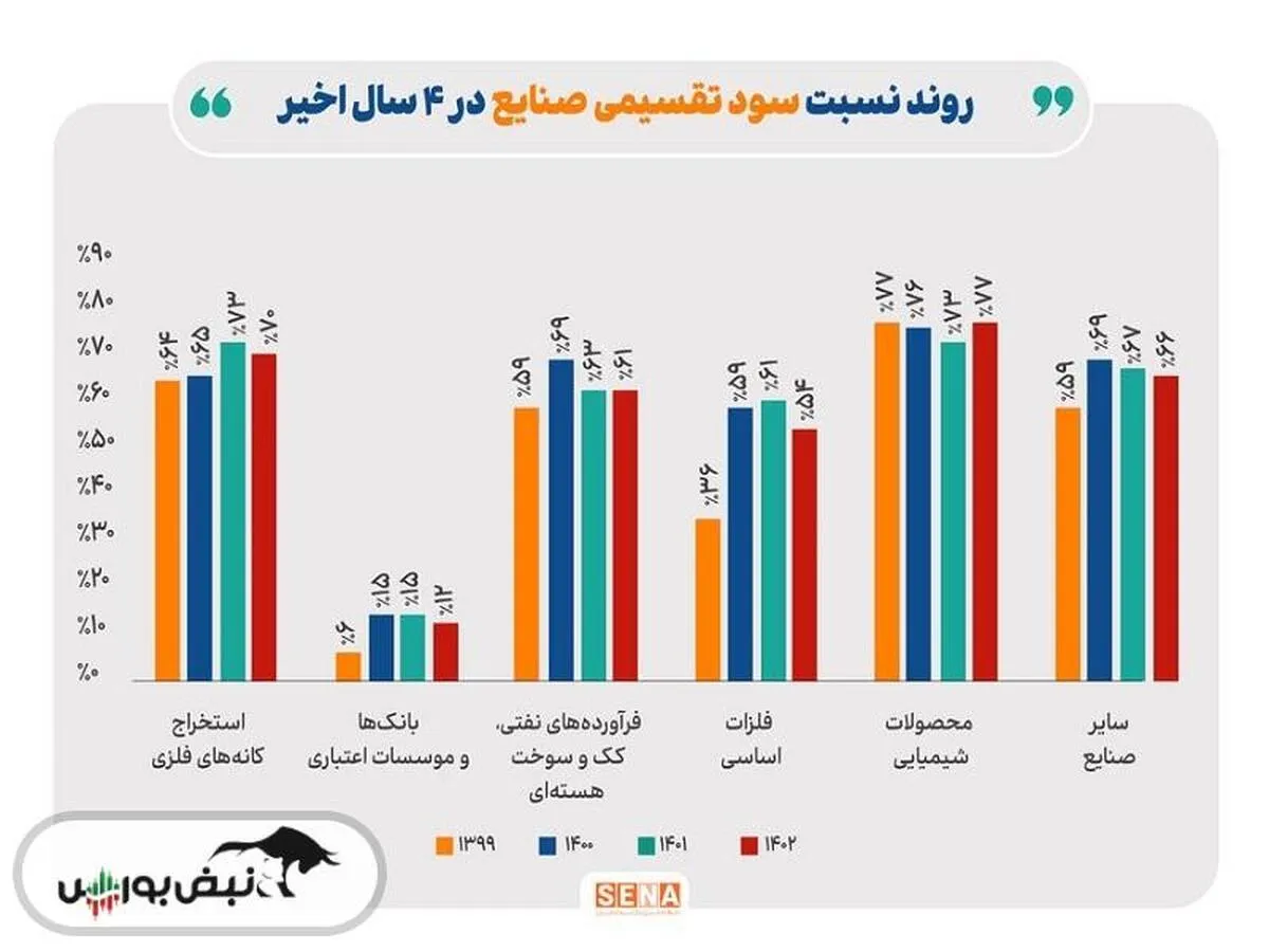 داده‌های اداره میزهای صنعت و رتبه‌بندی ناشران سازمان بورس و اوراق بهادار نشان می‌دهد؛ بیشترین نسبت تقسیم سود در بین صنایع بورسی، در ۴ سال اخیر، مربوط به صنعت محصولات شیمیایی بوده است.