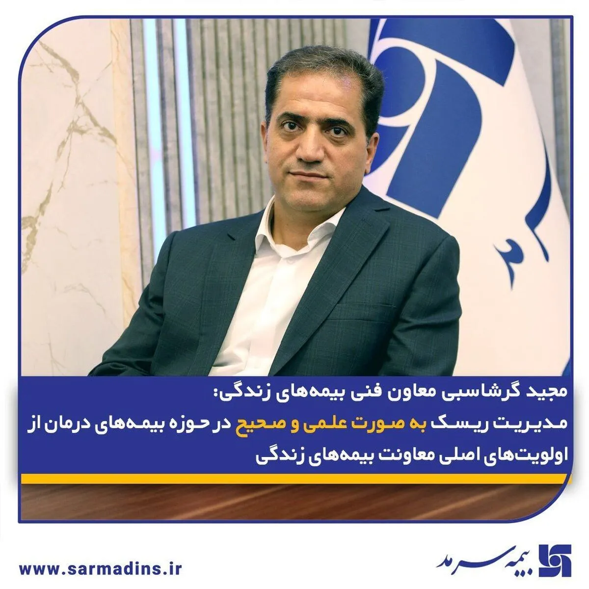مجید گرشاسبی معاون فنی بیمه‌های زندگی بیمه سرمد در مصاحبه‌ای با روابط عمومی شرکت، مدیریت ریسک به صورت علمی و صحیح در حوزه بیمه‌های درمان در جذب پرتفوهای مناسب و عدم ورود به پرتفوهای نامناسبت و زیان‌ده را از اولویت‌های اصلی معاونت بیمه‌های زندگی دانست.