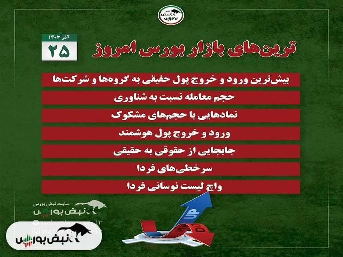 به گزارش نبض بورس، در این مطلب قصد داریم تا به بررسی ترینهای بورس امروز یکشنبه ۲۵ آذر ۱۴۰۳ بپردازیم. کدام نمادها خروج پول حقیقی داشتند؟