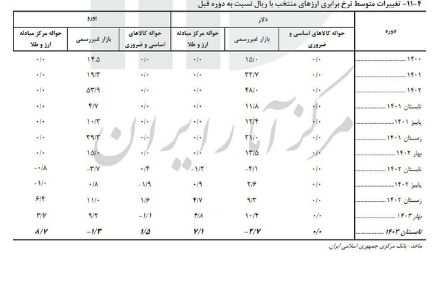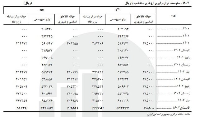 در فصل تابستان ۱۴۰۳ متوسط نرخ دلار در بازار آزاد برابر ۵۹ هزار و ۴۳۲ تومان بوده که نسبت به فصل قبلش ۷.۲ درصد کاهش داشته است.