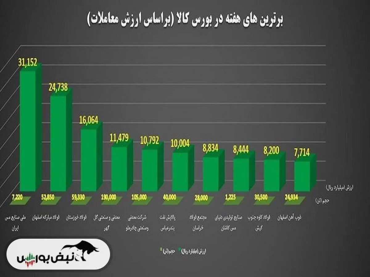 ۱- ملی صنایع مس ایران؛ با معامله ۷ هزار و ۲۲۰ تن سولفور مولیبدن، کنسانتره فلزات گرانبها و انواع مس به ارزش ۳ هزار و ۱۱۵ میلیارد تومان در رتبه نخست ایستاد.