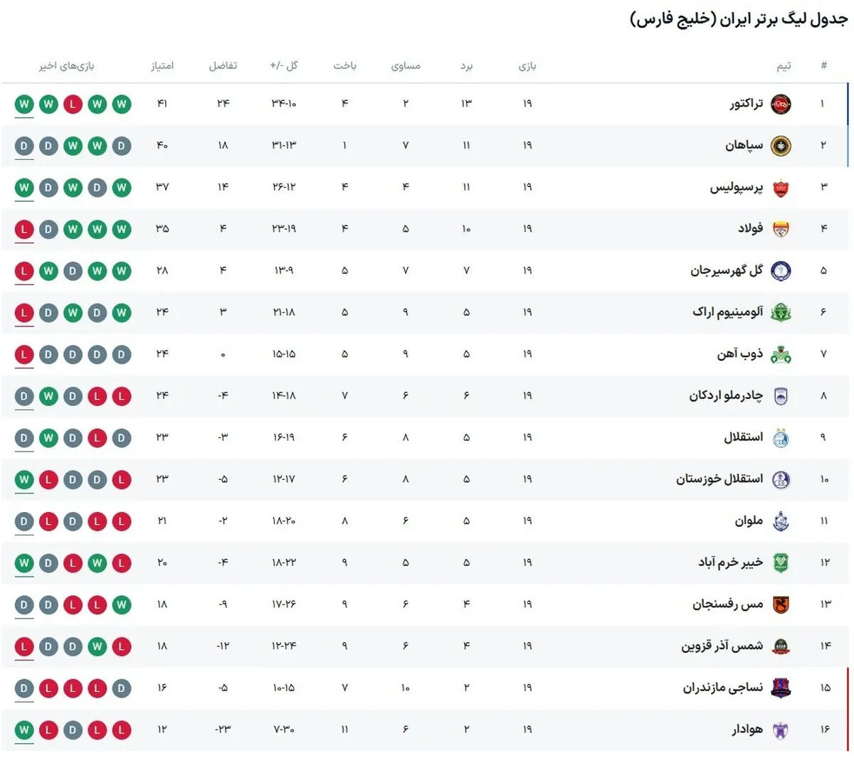هفته نوزدهم لیگ برتر فوتبال ایران عصر امروز با بازی پرسپولیس و گل گهر به پایان رسید. نتایج و جدول لیگ برتر به همراه برنامه بازی ها در هفته بیستم را ملاحظه میکنید.