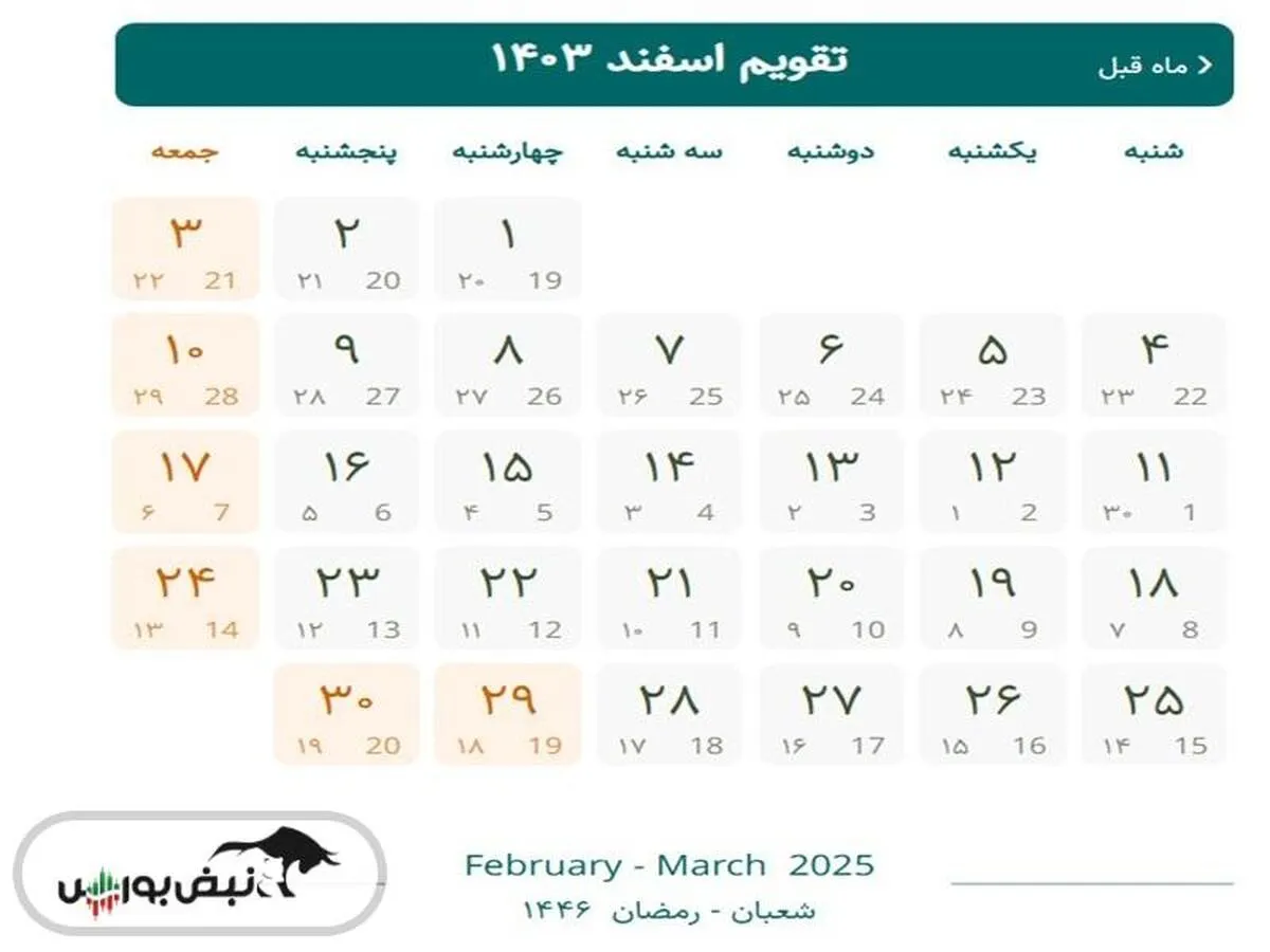 به گزارش نبض بورس، در این مطلب تقویم اسفند ماه ۱۴۰۳ را همراه با تمام تعطیلات و مناسبت‌ها مشاهده می‌کنید. در اسفند ماه فقط روز ۲۹ ام تعطیل رسمی می‌باشد.