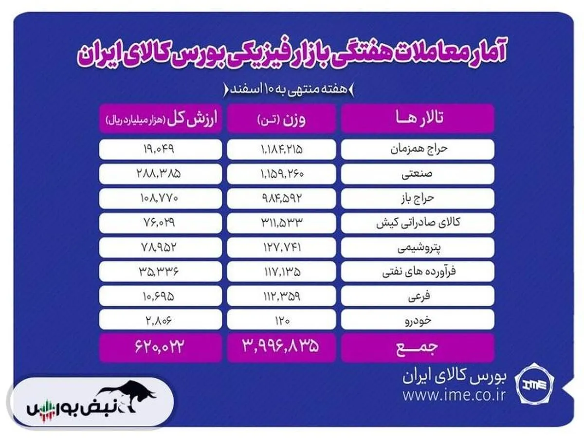 به گزارش نبض بورس، در هفته گذشته تالار محصولات صنعتی و معدنی شاهد معامله ۳ میلیون ۱۸۷ هزار و ۷۵۰ تن محصول به ارزش ۳۷ هزار میلیارد تومان بود.