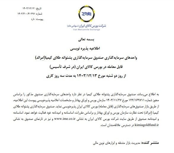 صندوق سرمایه گذاری پشتوانه طلای کیمیا در نظر دارد واحدهای سرمایه گذاری خود را براساس مجوز سازمان بورس و اوراق بهادار و مشخصات اعلامیه پذیره نویسی این اطلاعیه، از طریق بازار صندوق های سرمایه گذاری (قابل معامله) بورس کالای ایران پذیره نویسی کند.