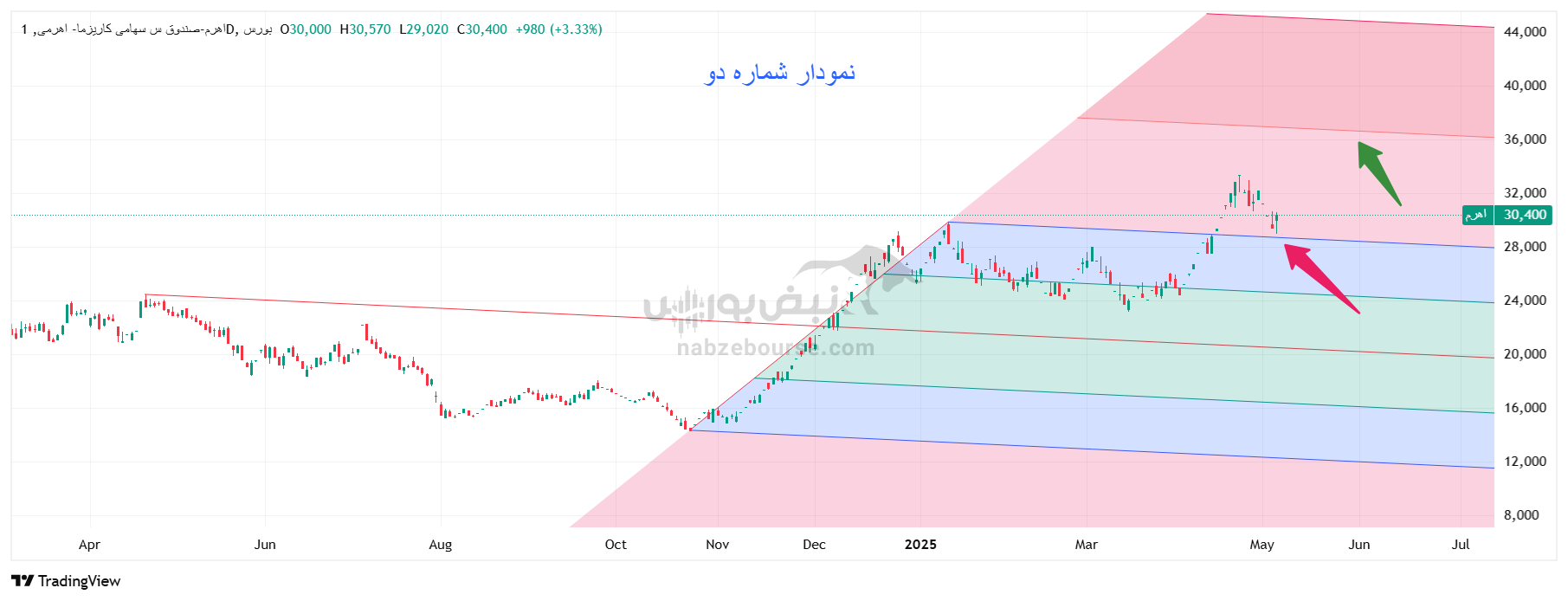 در نمودار شماره دو میتوان هدف اول نماد اهرم را حدود ۲۰ درصد رشد تخمین زد، البته یاداوری میشود که نیار است سهامداران محترم هر روزه بررسی را به روز نموده و در صورت مشاهده نشانههای تکنیکالی و یا سایر مسایل، تصمیمهای جدید متناسب با استراتژی شخصی اتخاذ نمایند و هیچ تحلیلی اصولا قطعی نیست، به بیانی این موضوع تفاوت پیشبینی با پیشگویی است.